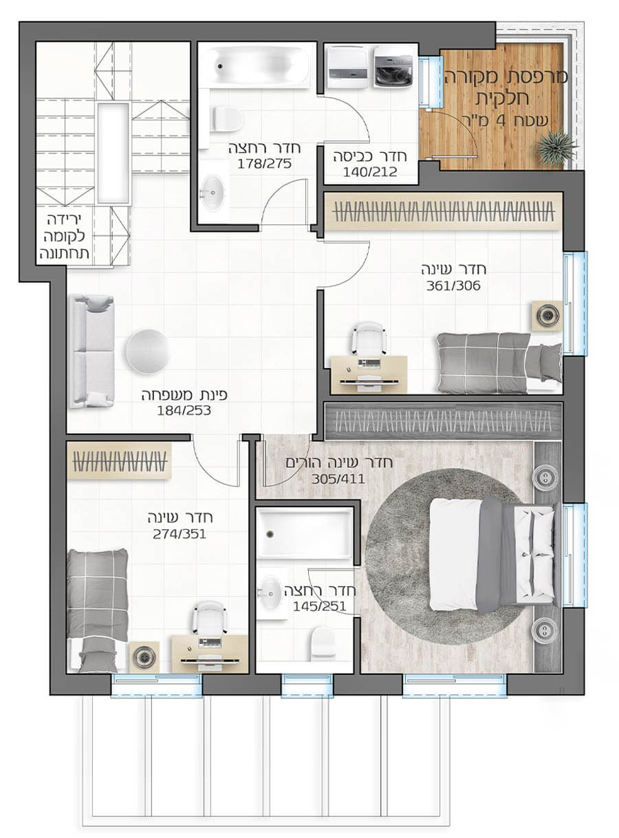 5 חדרים + 2 מרפסותשטח דירה 140 מ״ר